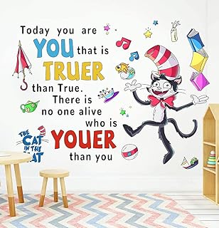 Supzone Dr Seuss ウォールステッカー 帽子をかぶった猫 壁デカール 引用句 'Today You are You DIY 壁アートステッカー 子供部屋 教室 読書 リビングルーム プレイルーム 壁装飾