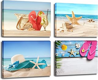 ビーチシェルウォールアート 夏休み パール ヒトデ ビーチテーマプリント アートワーク モダン オーシャン バスルーム 写真装飾 ペインティング 12x16インチ 4パネルラック オフィス ホームデコレーション
